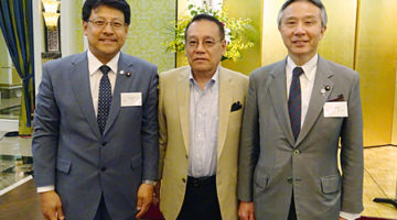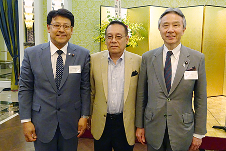 総会後の記念撮影。左から関芳弘・自民党副幹事長(兵庫3区選出、衆院議員)、当協会の久積・副会長、盛山正仁・法務副大臣兼内閣府副大臣(兵庫1区選出、衆院議員)