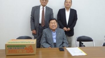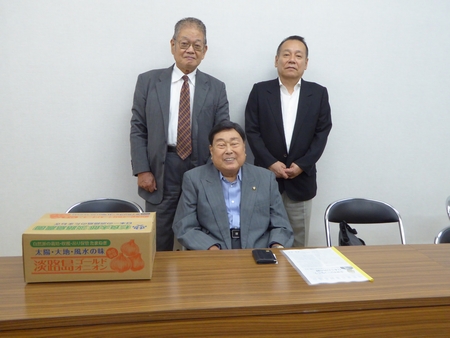 徳島県日華親善協会は日台にとどまらず国内の地域間交流にも取り組んでおります。今回は南あわじ市に表敬訪問して参りました。 (写真は今回意見交換を行った中田勝久南あわじ市長。) 当会から副会長の大神憲章副会長(左)、同じく副会長の久積副会長(右)らが訪問しました。意見交換の中で大神副会長の姪で、女子プロバスケットボール選手の大神雄子さんの南あわじ市へのスポーツイベントへの派遣提案等、様々な意見交換が行われました。 笑顔で話される中田市長。父親が旧三原町(現・南あわじ市)出身の杉良太郎さんが作った「淡路島農園」でとれるたまねぎを「日本一」と自負し、市長自ら先頭にたってPRするなど町づくりに積極果敢だ。またブランド産品の育成では、徳島と淡路のタイアップによる地域ブランドづくりの必要性も強調。鳴門の渦潮を世界遺産に登録し、鳴門・淡路島の連携を深めることが地域活性化に不可欠と熱弁した。 並んで写真撮影される中田市長と当会大神副会長、久積副会長。中田市長の隣にあるのが「日本一」を自負する杉良太郎ブランドの「淡路島ゴールドオニオン」。糖度の高さがPRポイントだ。