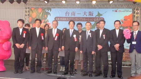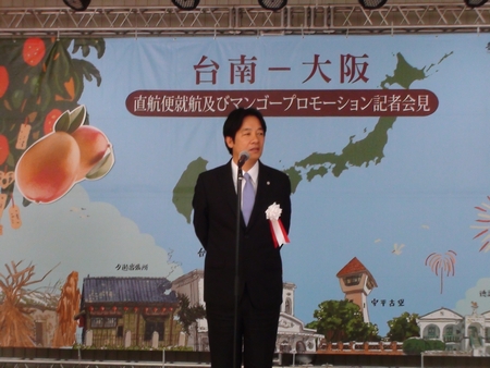 国内初となる台南-関西定期航空便就航記者会見に参加しました。  会場には多数の関係者・報道陣・ゲストが集い就航を祝しました。賴清德・台南市長が定期便就航会見と、マンゴーのプロモーションを行う姿に、当会も共に喜び祝しました。今後この定期便が日本と台湾の友好関係を深め、さらなる日台親善に拍車をかけることは間違いないでしょう。