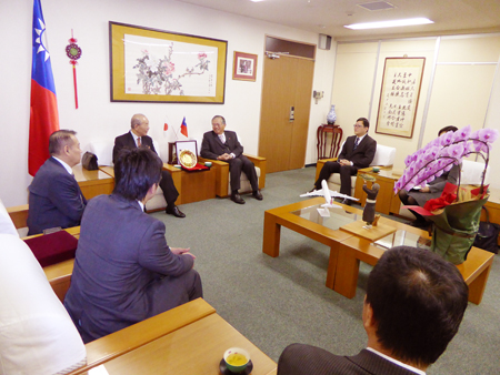 当会の地道な日華親善活動を台湾政府に評価され、この度表彰を受けました。今後更なる親善活動を行い、益々両国の架け橋になれるよう邁進する所存です。ありがとうございました。 (写真は台北駐大阪経済文化弁事処の蔡明耀処長(右)と折目信也当会会長(左)。 写真は台北駐大阪経済文化弁事処の蔡明耀処長(右)と久積会副会長(左) 蔡明耀処長と寄贈していただいた記念杯を中心に記念撮影をする当会会員。 (写真右から久積副会長、蔡明耀・大阪弁事事務処処長、折目当会会長、佐々木当会青年部長、鶴和当会員) 表彰を受けた後に和気藹々と歓談する台北駐大阪経済文化弁事処の方々と当会会員ら 台北駐大阪経済文化弁事処の蔡明耀処長の話を熱心に聞き入る折目当会会長(写真中央)と久積当会副会長(写真左)