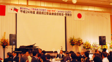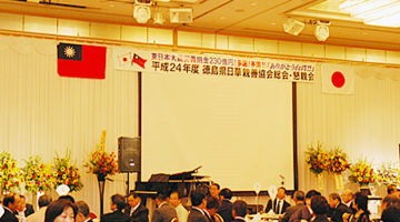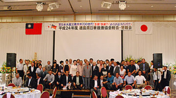 徳島市のホテルクレメントにて総会を開催しました。先の東日本大震災の義援金として、総額230億円を超える寄付及び多くの救援物資を送っていただいた台湾の支援者に感謝の意を表し、出席していただいたた中華民国・台湾に、「ありがとう、台湾!」の感謝を込めて、来賓出席した台北駐大阪経済文化弁事処(大阪総領事館)の謝文發(シャブンハツ)副処長に、折目信也会長らが当協会を代表して感謝のメッセージを贈りました。
