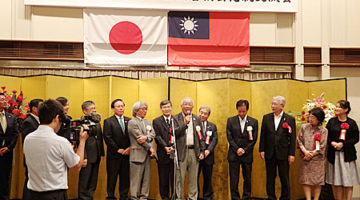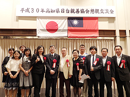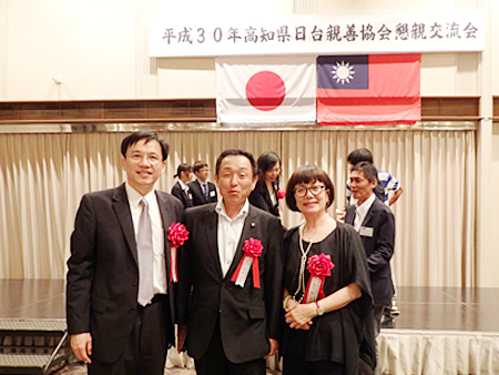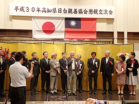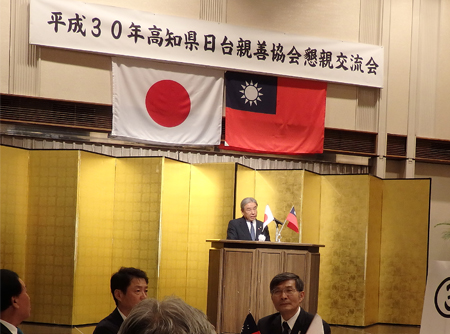 主催者を代表して有田会長が挨拶。「今後とも行政機関と台湾との交流のお手伝いなど、精力的に活動していきたい」と意気込みを語った 高知市の岡崎市長(中)、高知県大阪事務所の濵鍋所長(左)と談笑する徳島日華の久積副会長。 台北駐大阪経済弁事処の蘇啓誠処長と記念撮影に納まる日台の関係者。徳島日華の役員らも活発に意見交換した。 来賓として参加した徳島県日華親善協会の井上武会長。高知県日台親善協会の取り組みを高く評価し、「高知を範としてがんばりたい」とエールを送った 台湾貿易センター大阪事務所の林志鴻所長と劉慧明部長と写真に納まる斎藤智彦・徳島市議。日台の経済交流について活発に意見交換した。 高知市議会の高木議長(右)と徳島市議会議長の徳島日華の井上会長。議会運営などについて語り合った。 「文化交流や観光振興で日台の絆を深めよう」と閉会の挨拶をした高知県日台親善協会の福島明理事。高知市議を務め、市議会では100代目の議長を務めた。