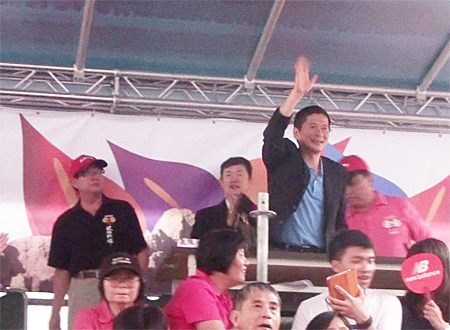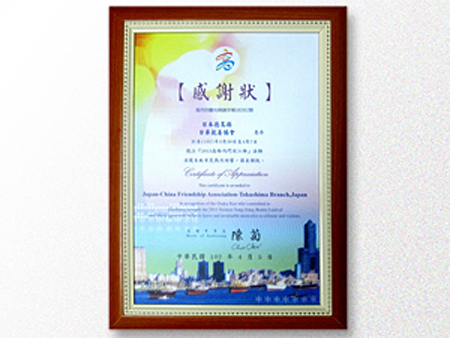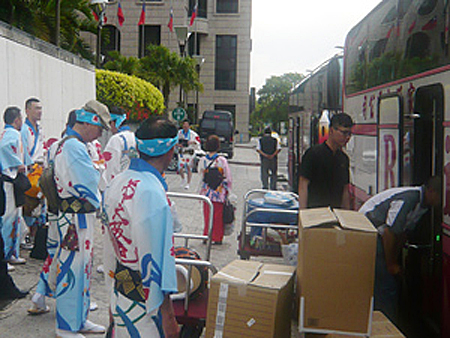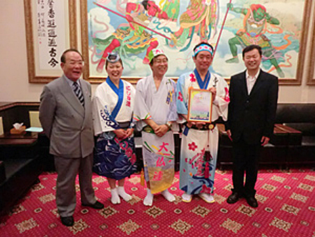 大歓声の中、宋江陣のステージに登場した李永得・高雄市副市長。人気の高い人物です。 中国拳法の模範演技。さすが本場だけあって切れ味鋭い拳法の動きに驚嘆する。 メイン会場で阿波踊りを踊る南大阪連、にしき連、奈良大仏連の踊り子たち。 高雄市の人々には耳慣れない「よしこの」のリズムであったが、次第に手拍子が大きくなり、最後には市民が入り乱れての大乱舞になった。 移動中の踊り子たち。緊張と疲れはあるが皆楽しんで阿波踊りを披露できたという満足感があったという。 宋江陣での活躍に高雄市観光局長から感謝状を頂いた南大阪連、奈良大仏連、にしき連の連長と折目会長(左)。 協会が受け取った感謝状です。ありがとうございました 主賓席で並んで座る李永得・高雄市副市長(右)と、久積・徳島県日華親善協会副会長。