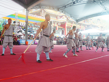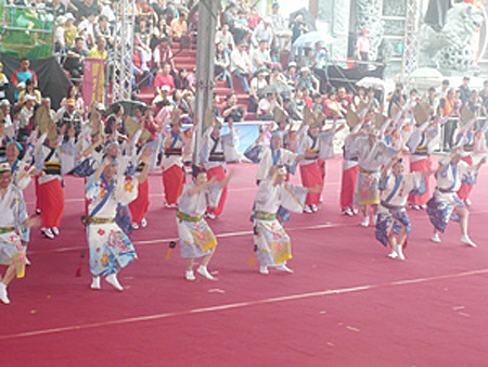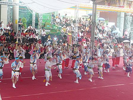 台湾12大祭りの一つとされる高雄市の宋江陣に初参加した「南大阪連」「奈良大仏連」「にしき連」合同による阿波踊り。
