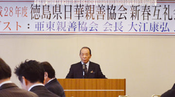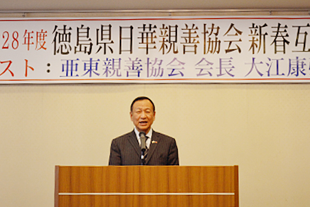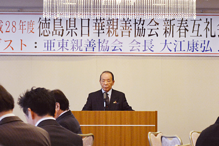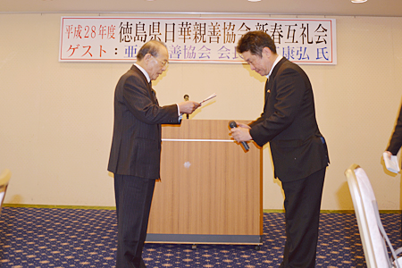 2016年度新春互礼会を、徳島市内のホテル千秋閣・鳳の間で開催しました。全会員の内、約60名が集まりました 開会にあたり、折目信也当協会会長が昨年のの活動報告を行いました 来賓の岩浅嘉仁阿南市長が登壇され、個人的な台湾の思い出や行政の長としての日台友好の思いなど、大変ためになる話をしていただきました。 お忙しく全国を飛び回る亜東親善協会の大江康弘会長が、互礼会に参加していただけました。 ※亜東親善協会は、台湾側の外交窓口である亜東関係協会の日本側の受け口で、台湾との外務省的役割を果たす機関です。 大神憲章・当協会副会長が台湾との繋がり、昨年台湾・花蓮県にある吉安郷を訪問したことを報告、同郷が日本人が開拓した元・吉野村と呼ばれた徳島県民が中心になって創られた村で、そこに寺院を建立したこと、そしてその寺院が「慶修院」という名で現在も地元の人々に愛されていることなどを紹介しました。住職である同副会長が昨年、その慶修院で読経したことなどを発表しました。 高雄市や台南市などで阿波踊りを踊った「南大阪連」は、先の台南地震の義援金を当協会の折目会長に手渡しました。この義援金は当協会が責任を持って、台北駐大阪経済文化弁事処にお渡しすることを約束しました。 食事会では、当協会の会員が食事をしながら会員同士の会話を楽しみました。 亜東親善協会・大江会長と一緒に記念撮影をする当協会の幹部(左から大神憲章副会長、折目信也会長、久積副会長)。