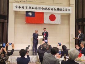 高知県日台親善協会は民間主導で高知と台湾の交流活動を牽引し、官民一体となった高知と台湾の交流関係の礎を築きました。交流会では高知県日台親善協会の長年の功績を称えて、洪処長から有田会長に感謝状が贈られました。